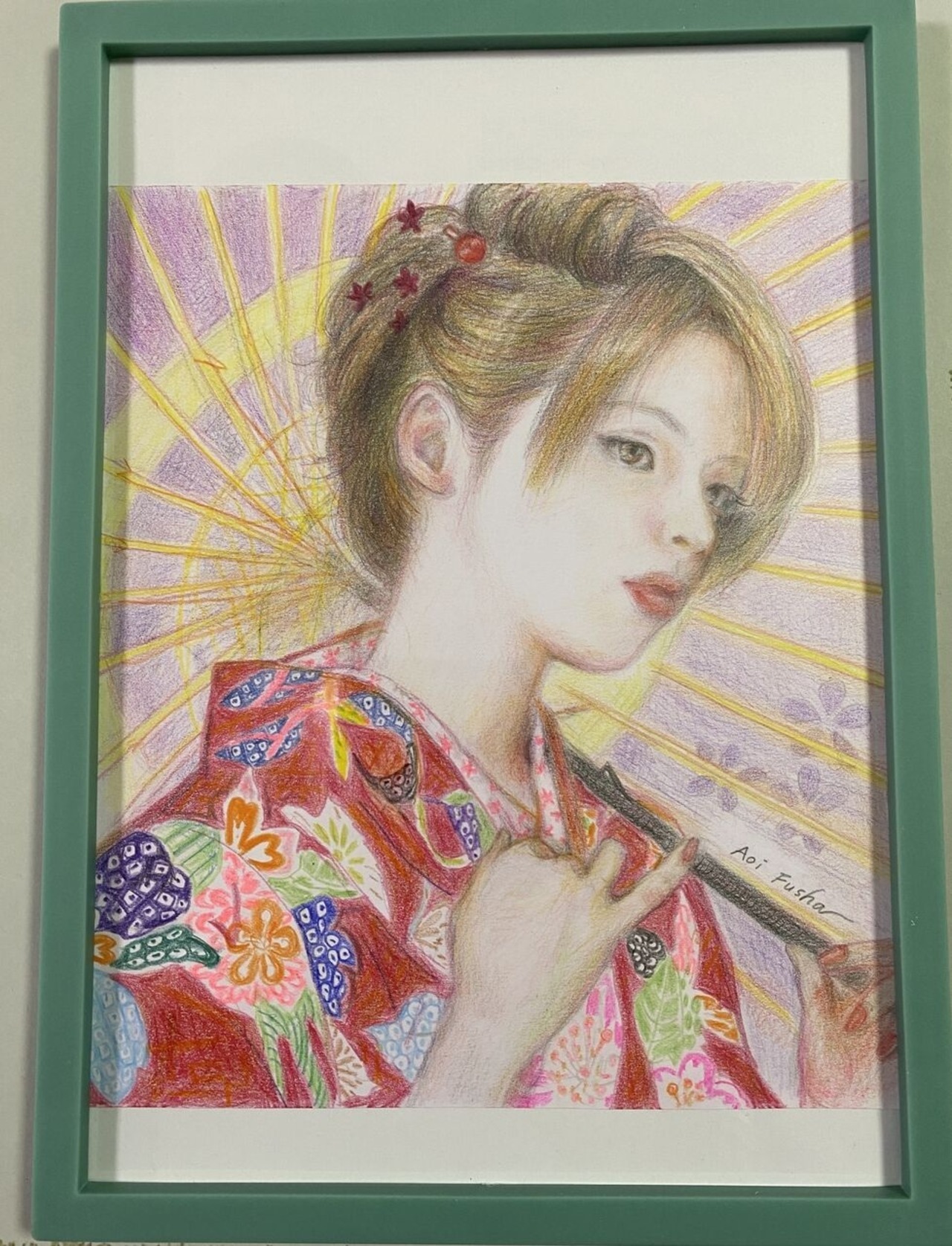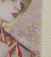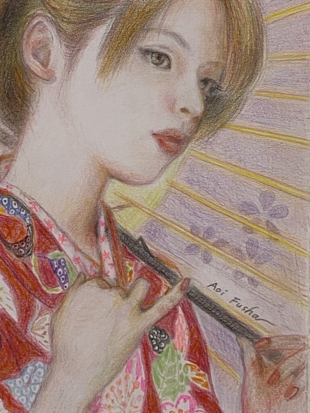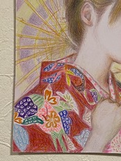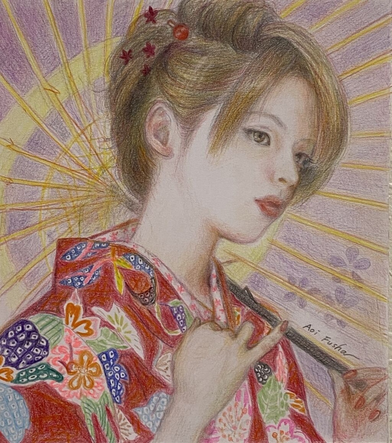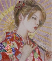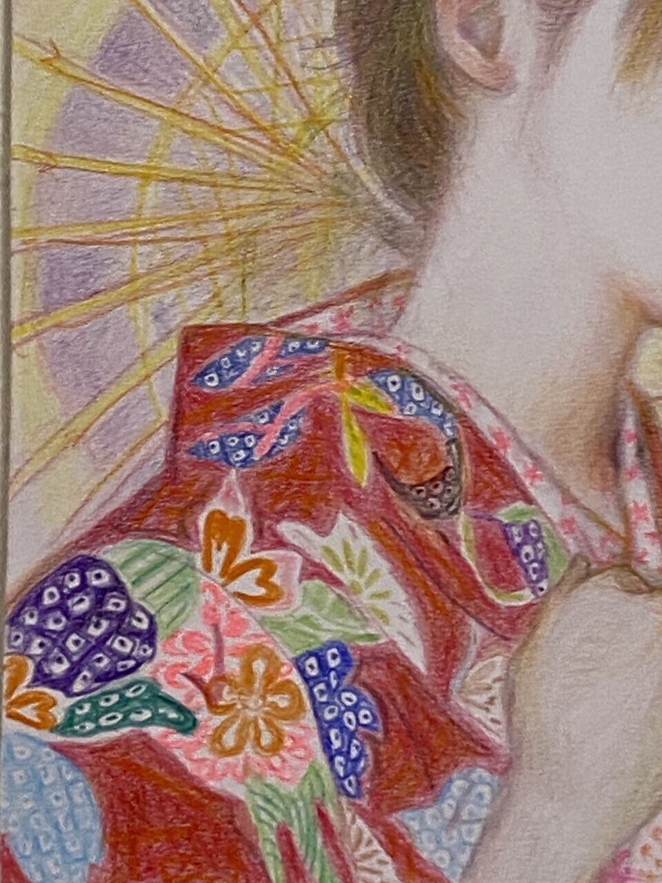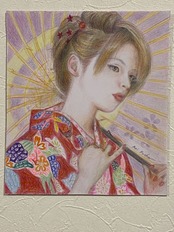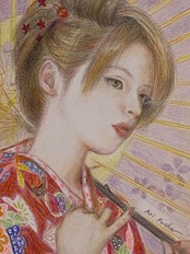 和装の女の子が日本唐傘をさしている様子を描きました